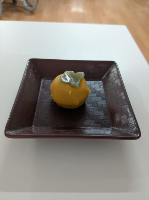 おやつ♪♪ 2025年11月25日 日脚もめっきり短くなり、冬の訪れを感じておりますが、お変わりありませんか? 菊水苑 介護職員 北野上です。 先日おやつの際に秋の訪れを感じる上生菓子 柿の提供がありました。 季節を感じる柿のおやつを見た瞬間「わぁー綺麗(^^♪かわいらしい」「こんな可愛いおやつ食べるの、もったいないわー」と大喜び!(^^)! おやつは一瞬で食べ終わっちゃいましたが、「おいしかったー」と言って頂けてよかったです。