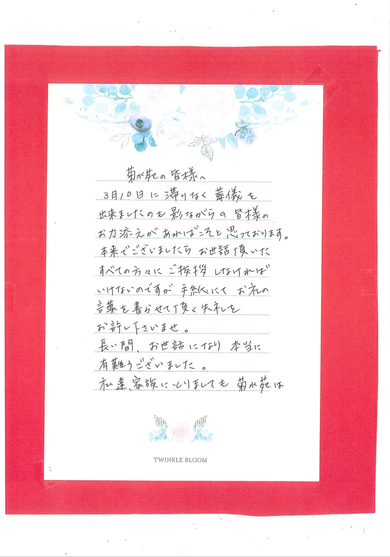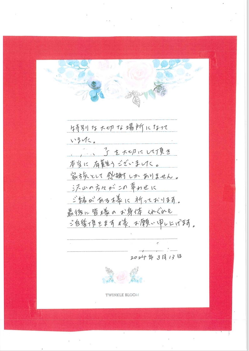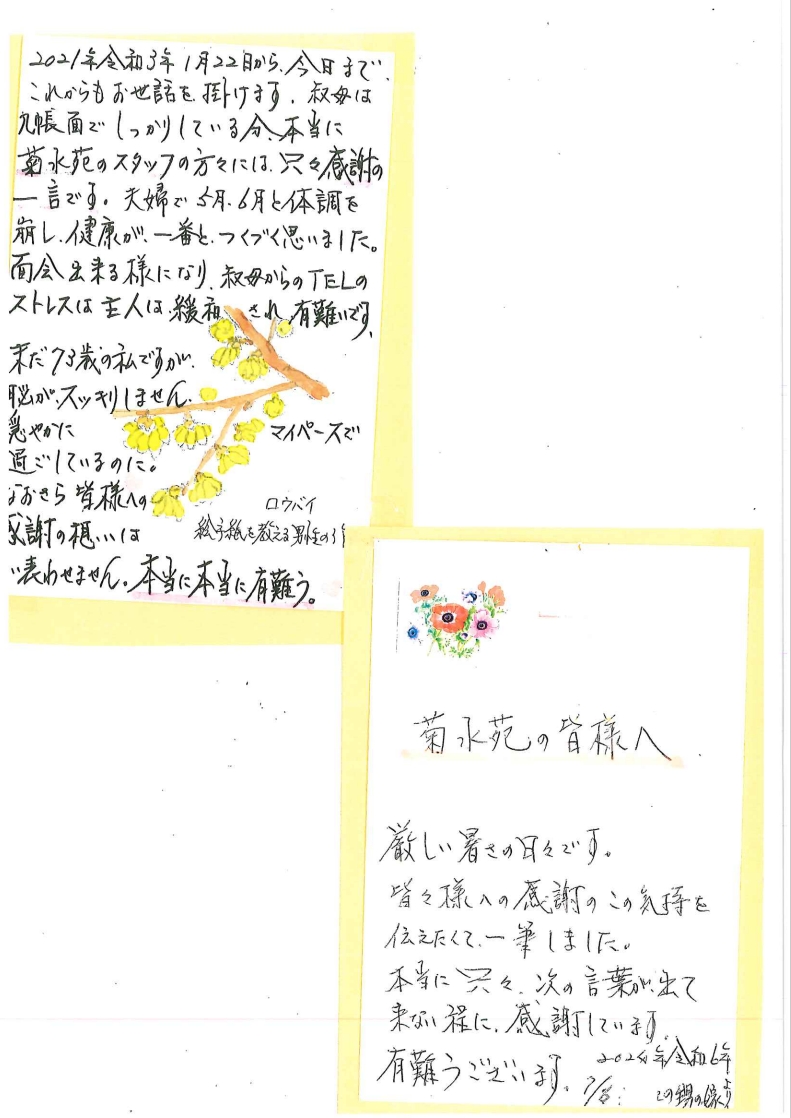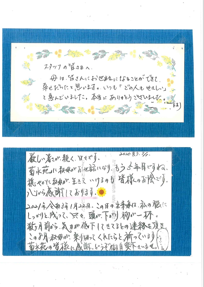 掲載させていただきます。ご利用者様やご家族様の思いが込められた文面を是非ご覧ください。