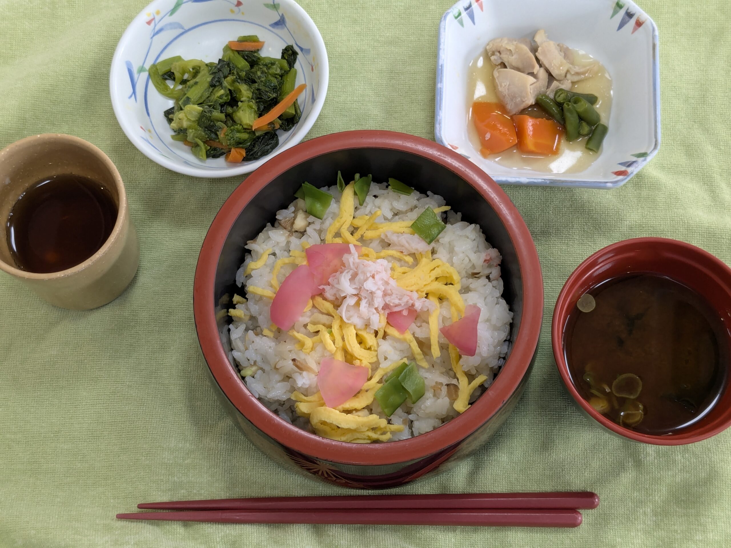 ひな祭り会食 2026年3月3日 こんにちは!介護職員の梶谷です。 今日は、ひな祭りとういう事でひな祭りの行事食を楽しんでいただきました。 お食事を見て「ひな祭りはちらし寿司やね!」「いつもと違う器やから、お店に来たみたい!」とみなさま楽しそうに話されながら行事食を堪能されていました。 そして今回のおやつは・・・美味しそうな和菓子! 今日は、ひな祭りをたくさん感じていただける1日でした。今回の行事も ご利用者様にとって良い思い出となれば、うれしいです(^▽^)/