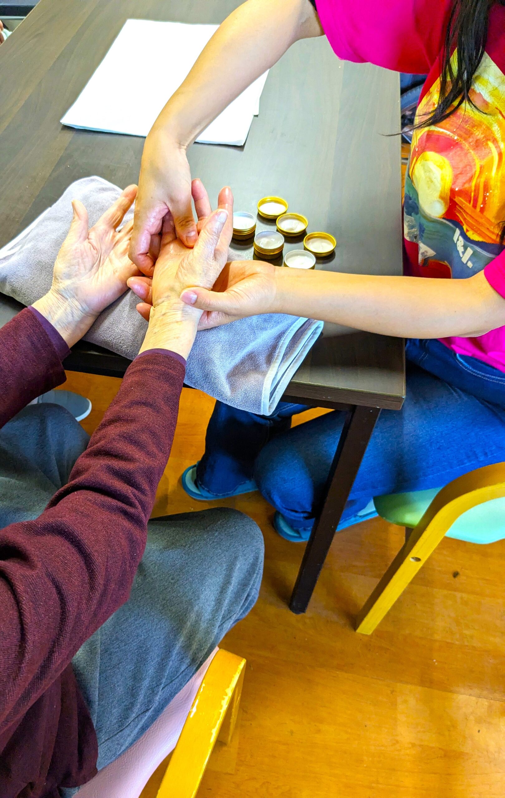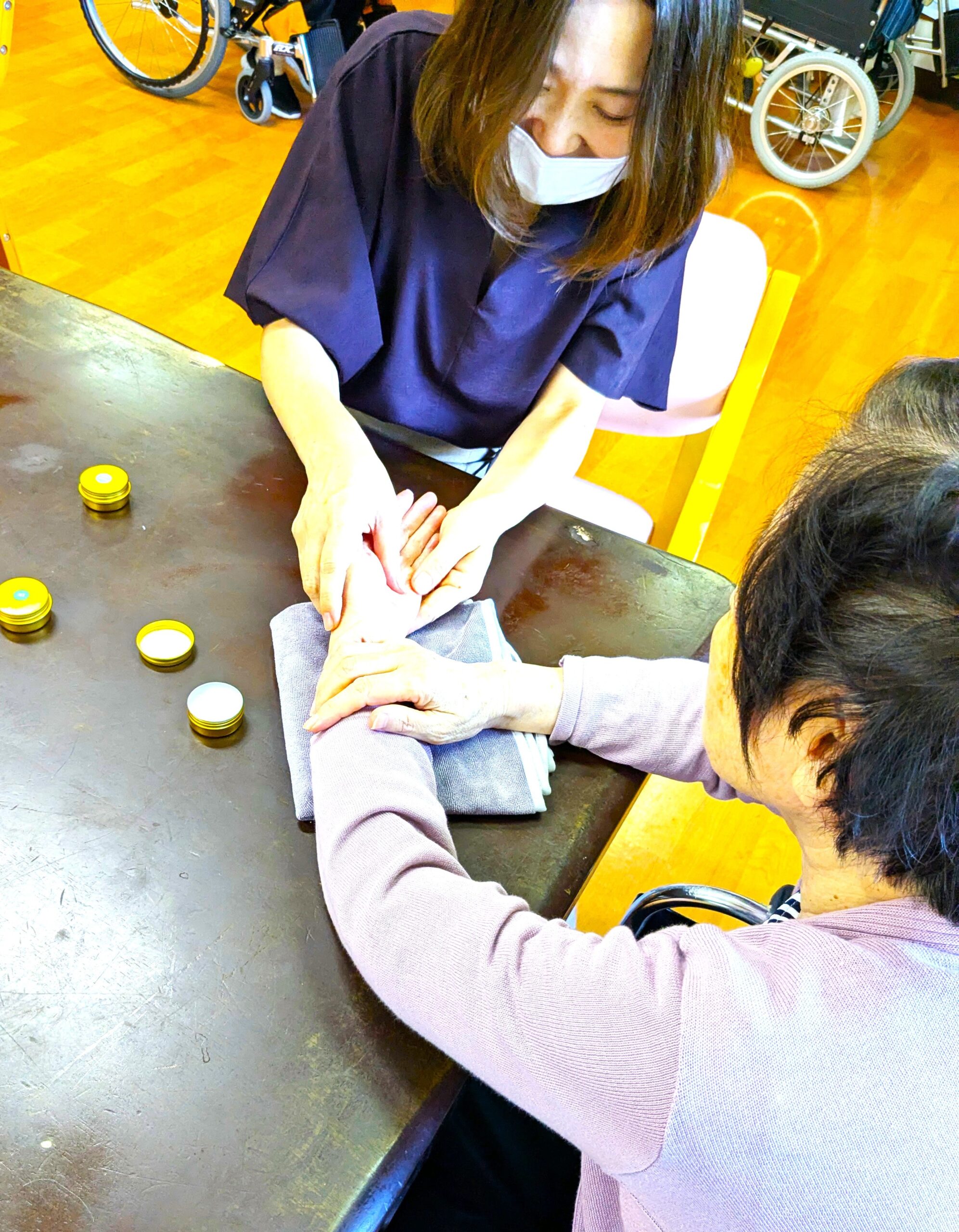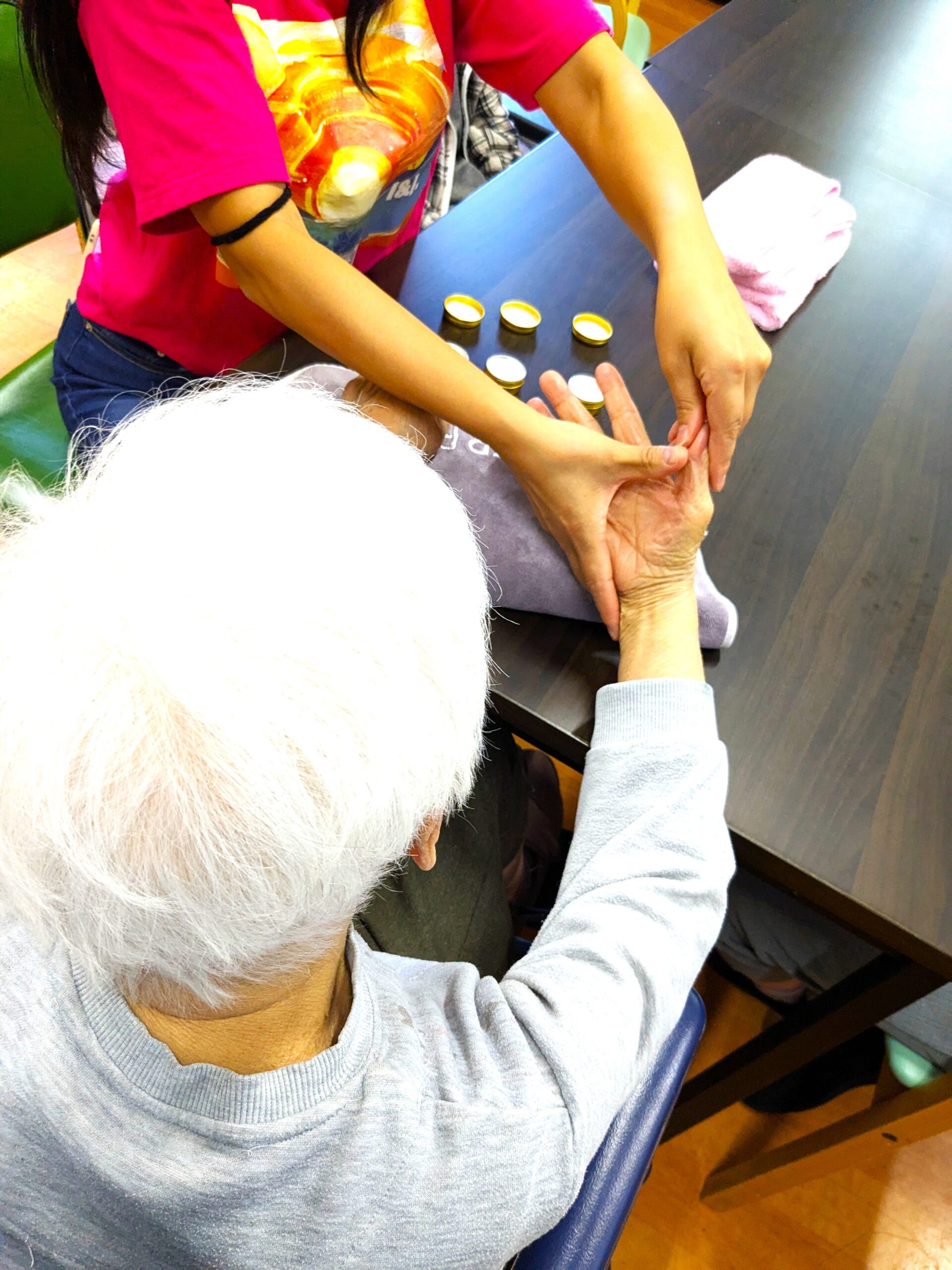 ハンドマッサージ 2025年10月5日 秋らしい晴天が続いております。ご家族様お変わりなくお過ごしでしょうか。 菊水苑介護職の北野上です。 先日、ボランティアの方に来苑して頂き、アロマオイルを使ったクリームを使い、利用者様へハンドマッサージをしてもらいました。 「こんな事してもらったの生まれてはじめてやわ」「気持ちいいわー」と大変喜んで頂けました。今後もみなさんに喜んで頂ける企画をこれからも考えていきたいと思います。