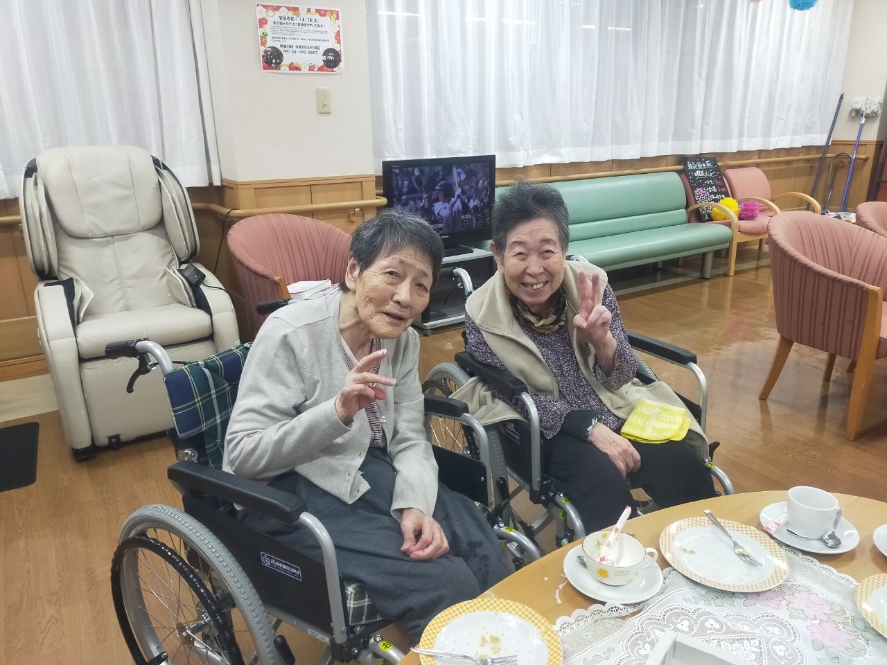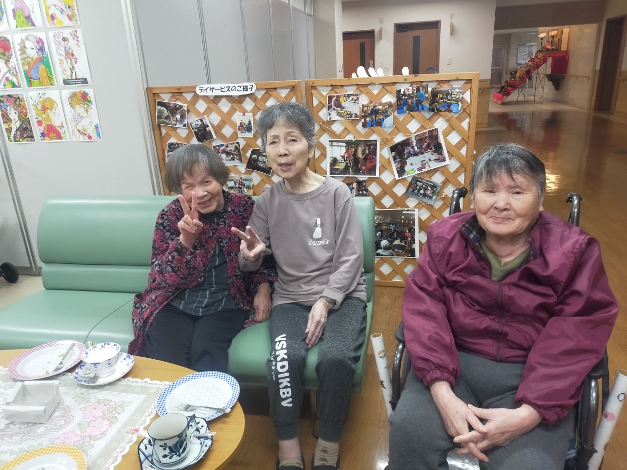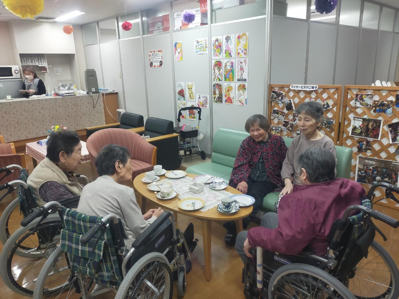 女子会🥳 2026年3月19日 本日喫茶コーナーにて各フロアの入所者様が一緒になり、会話が弾み 女子トークに大盛り上がりとなりました。 本日より喫茶コーナーのメニューに「クリームソーダー」が加わりました。 喫茶コーナーは毎週月、火、木、金の9:30~11:30 13:30~15:30の時間に開催 していますので面会時はゆっくりした空間でお過ごしください。