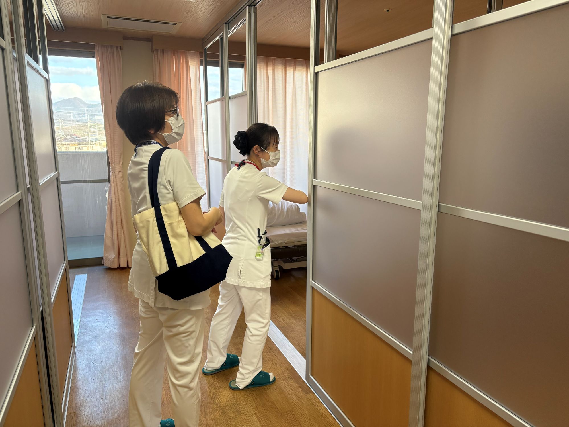 令和8年3月10日にPL病院蚊野様と笠谷様に来苑していただき、「手指衛生」と個人防護具(PPE)着脱方法