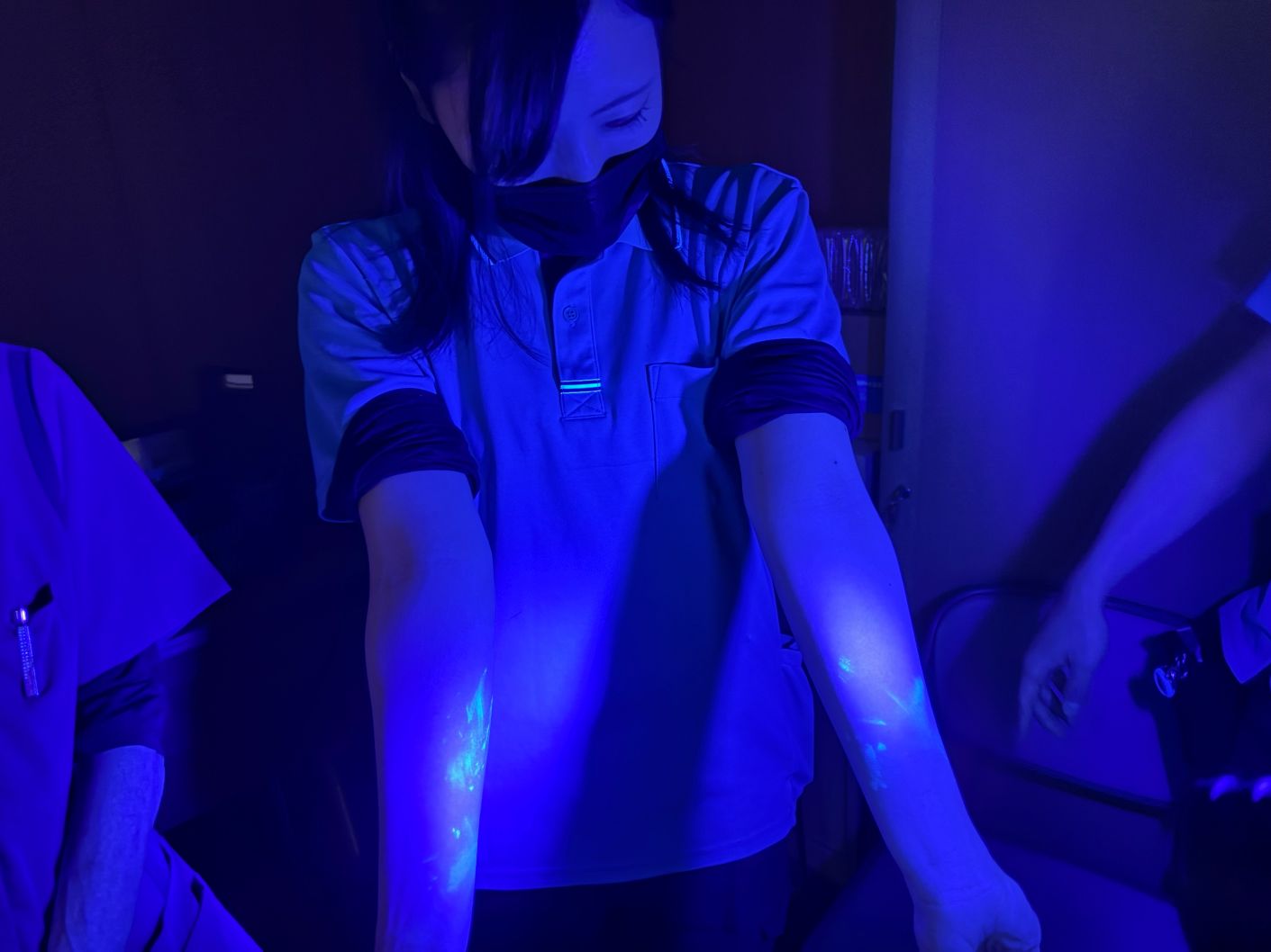 個人防護具に関しては、着脱の仕方でどれだけ菌が体に付着しているか理解するため、蛍光塗料をエプロン