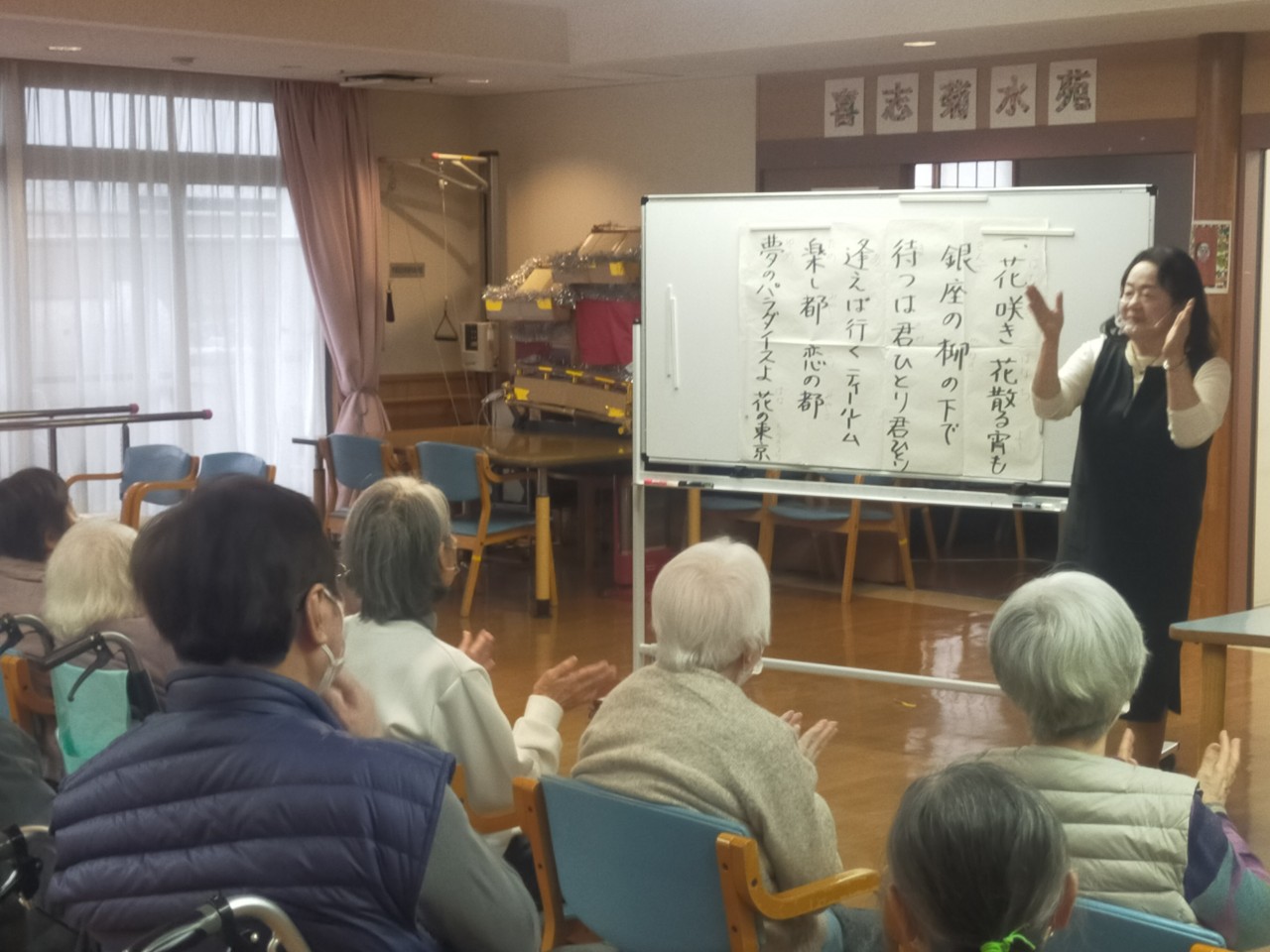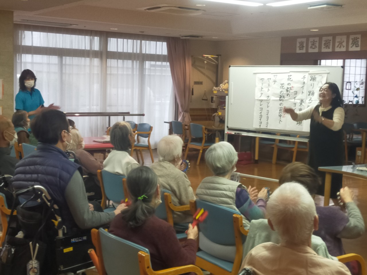本日は午後より音楽療法♪ 先生の地調査によると小学生が今一番行きたい都市「東京」にちなんで「東京ラプソディー」「東京音頭」と東京にまつわる曲を熱唱♪ 音楽療法が終わっても仲良しメンバーで二次会を行いました。