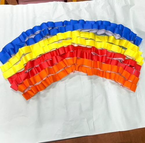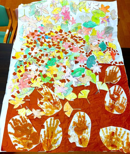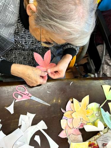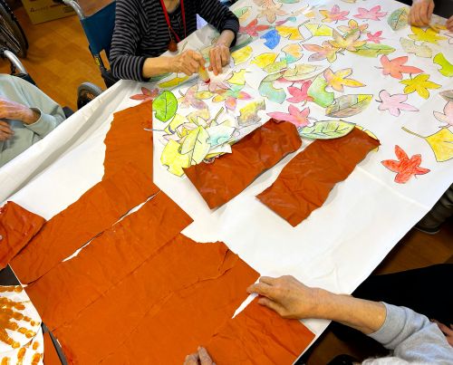 今回は「秋の作品作り」とついて、少しお話をさせて頂きたいと思います。先日、利用者様と一緒に「紅葉の貼り絵作り」と「虹色のレインボーのアート作り」をしました。普段、塗り絵に取り組んで下っている方には紅葉の塗り絵を塗って頂き、塗り絵が難しい方には折り紙や手形アートをして頂き、皆で一つ一つ切り抜いたり、貼りつけたりと協力しながら、一つの作品が出来上がりました(o^―^o)利用者様も最初は「どんな物を出来るのかな。想像がつかないわ」と不安そうにされていましたが出来上がった作品を観て、「良い感じになって良かったわ。頑張って良かった」と喜ばれていました。これでまた、一つ素敵な作品が出来ました♪