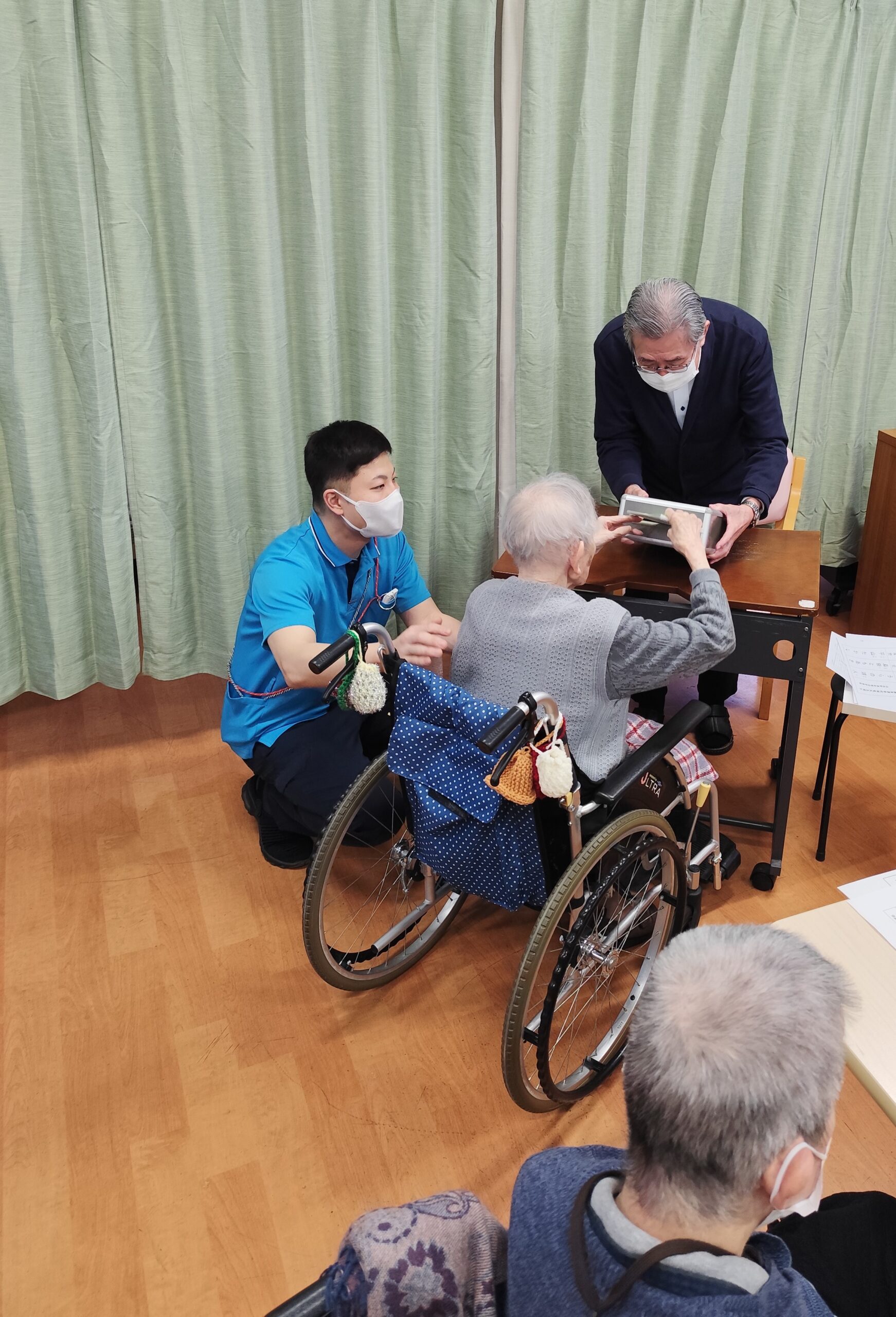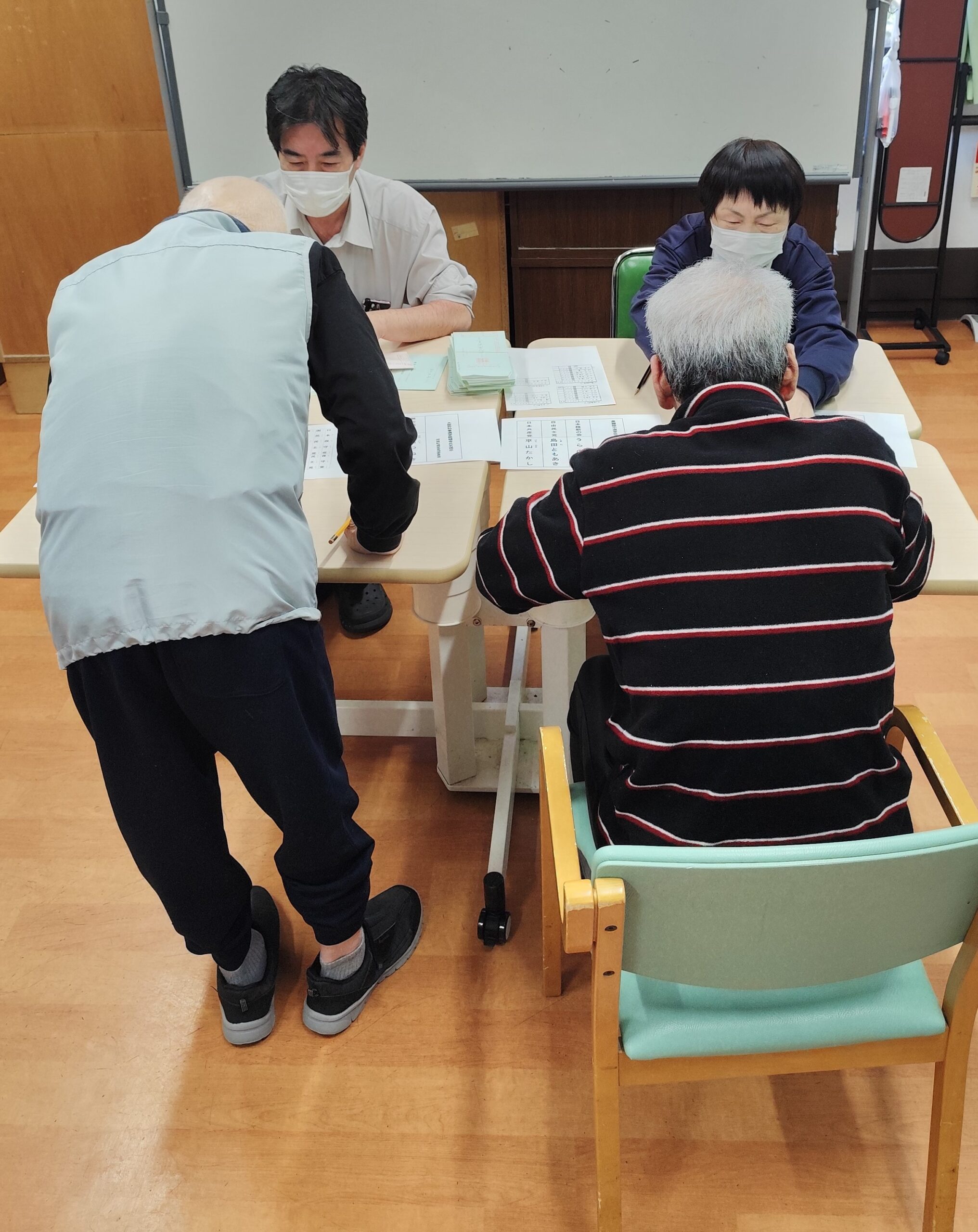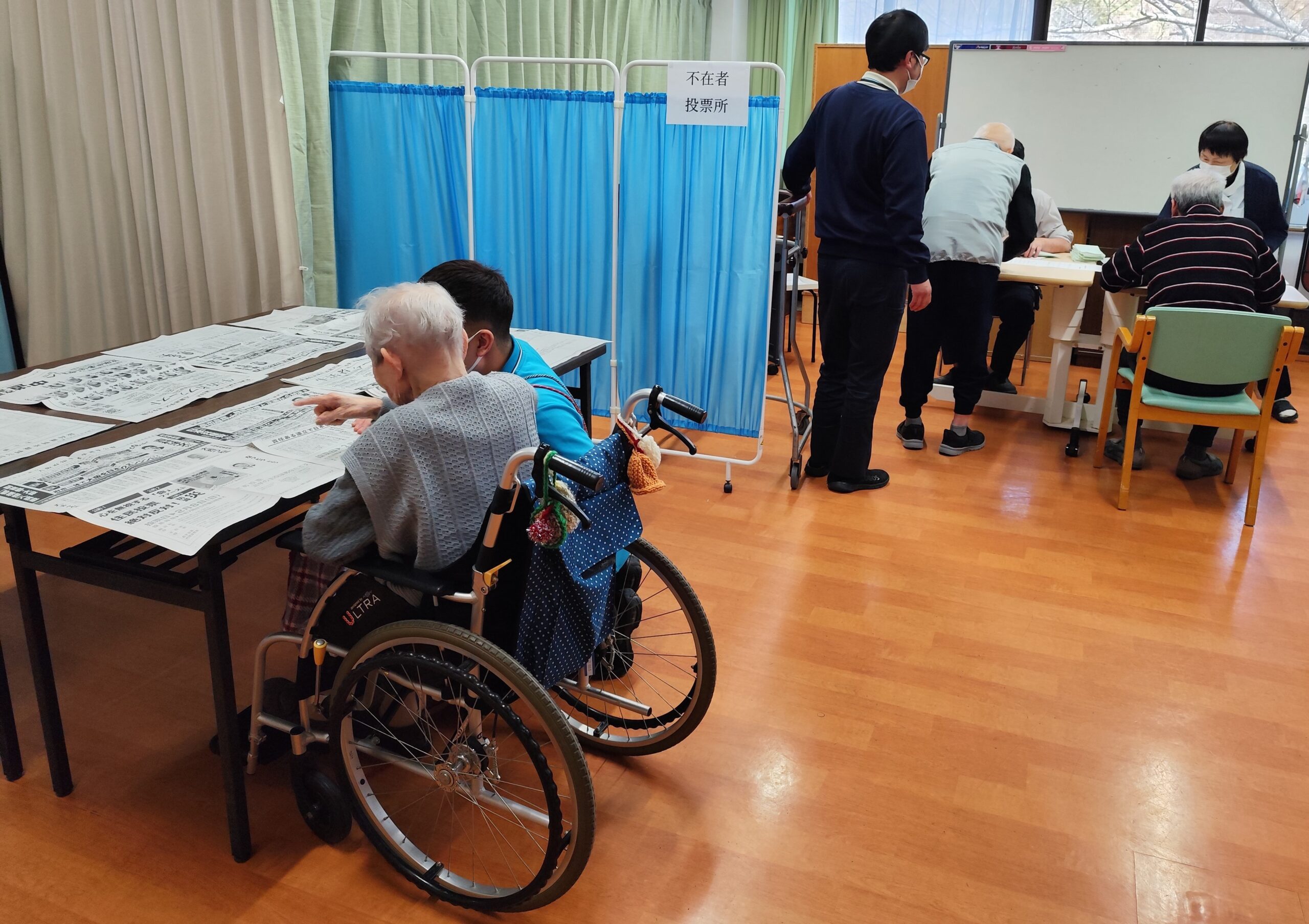 「字が書けないから、代わりに書いて欲しい。」という入所者様には、職員がお手伝いさせていただき、無事に不在者投票を終える事ができました。
