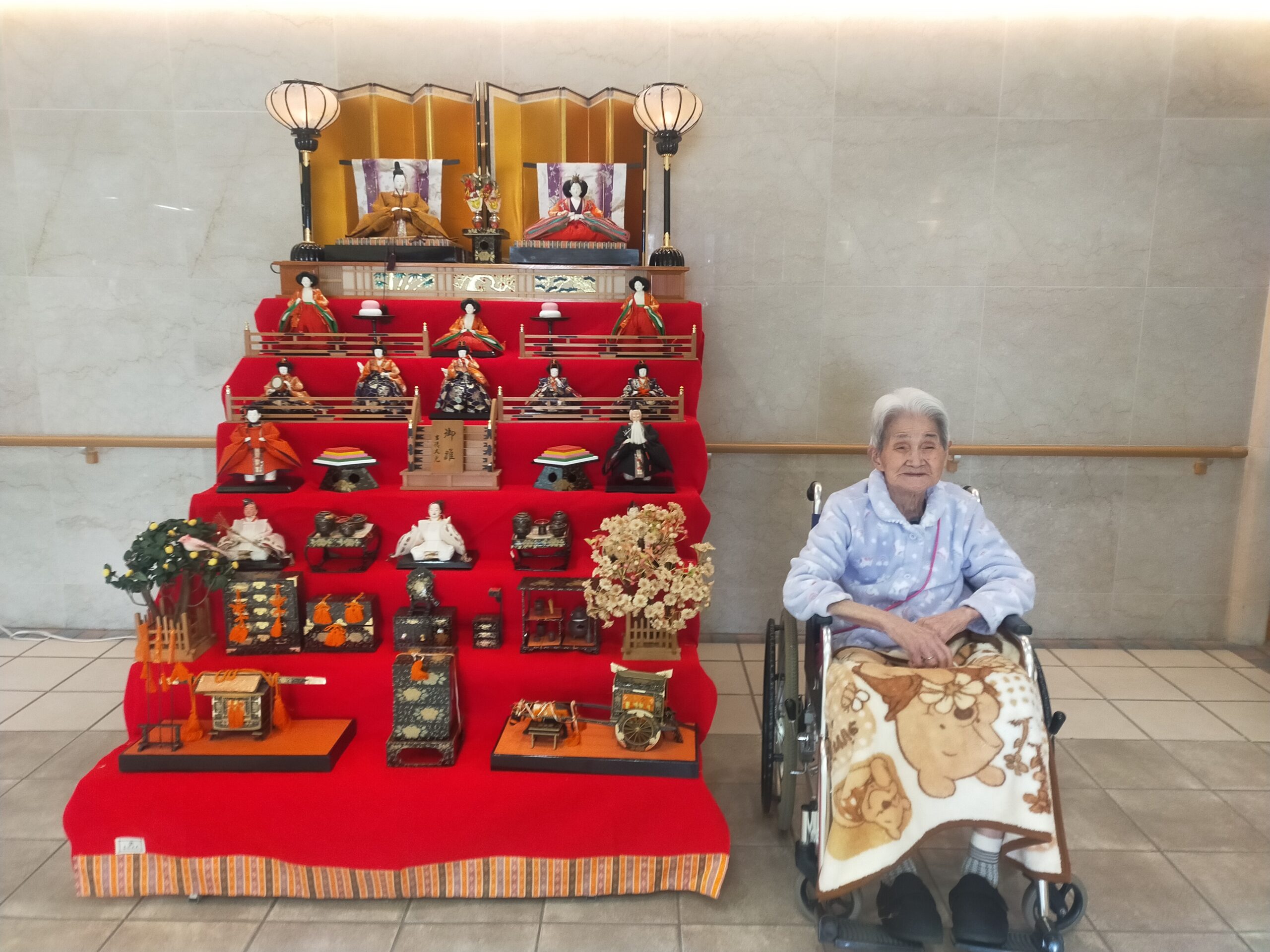 雛人形🎎 2026年2月13日 本日より玄関に雛人形を飾っております。 ご来苑の際は、写真撮影していただければと思います。 利用者様も大喜びで、「私もお雛様のところに飾って!」冗談を言われる方もおられました。 早速、ベストショットを撮影させていただきました。
