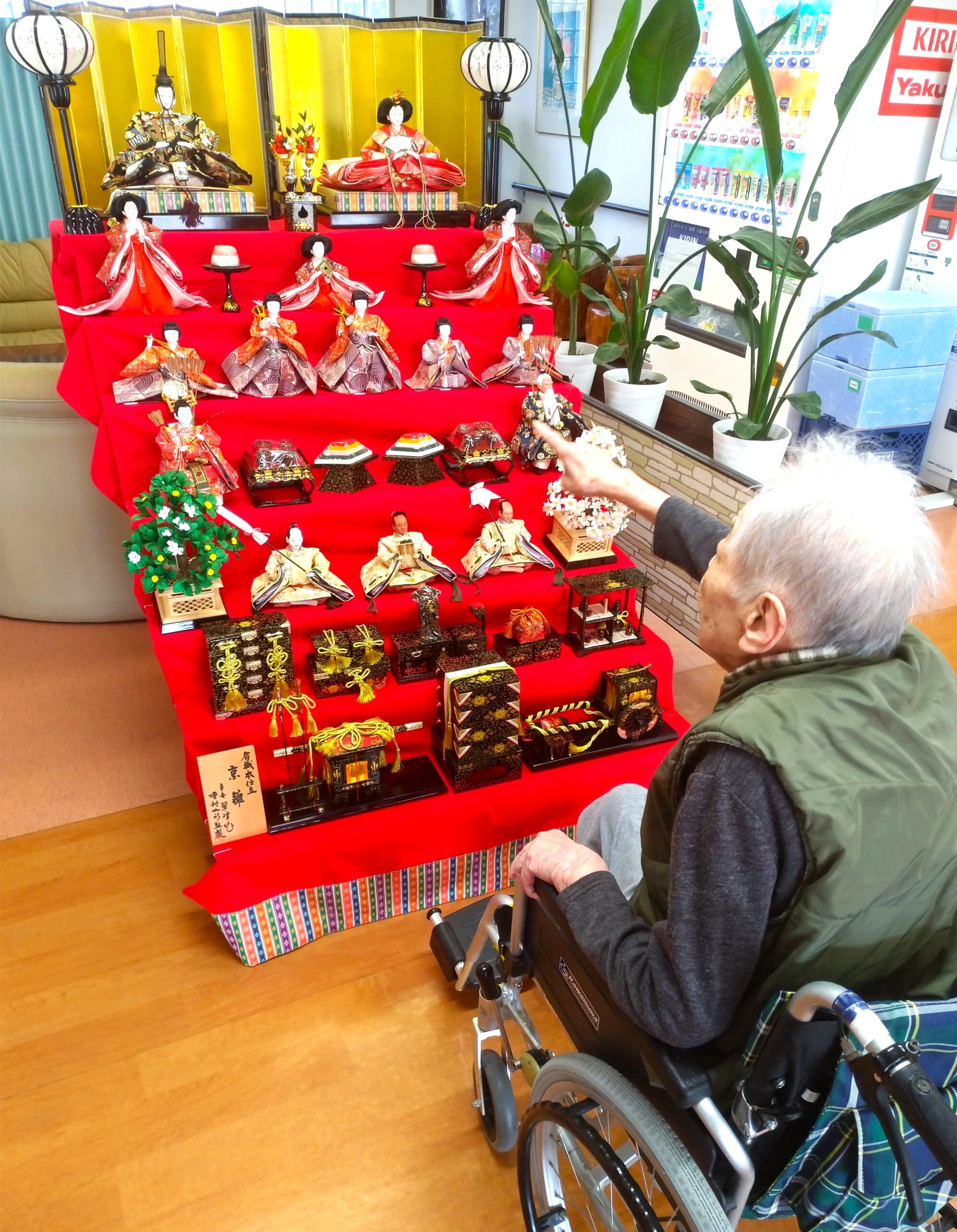 ~🎎雛人形🎎~ 2026年2月21日 こんにちは、菊水苑ショート担当の佐伯です。 菊水苑では昨日、1階談話室前に「雛人形」の飾り付けをしました🎎 菊水苑の雛人形は7段飾りであり、飾り付けは四苦八苦しましたが、出来上がり写真と見比べながらなんとか無事に飾り付ける事ができました。 家族様や御利用者様からは「立派な雛人形やね~」「綺麗に飾っているね」と言われ、記念に写真を撮られている方もいらっしゃいました📷 菊水苑にお越しの際には是非7段飾りの雛人形を観ていってくださいね~