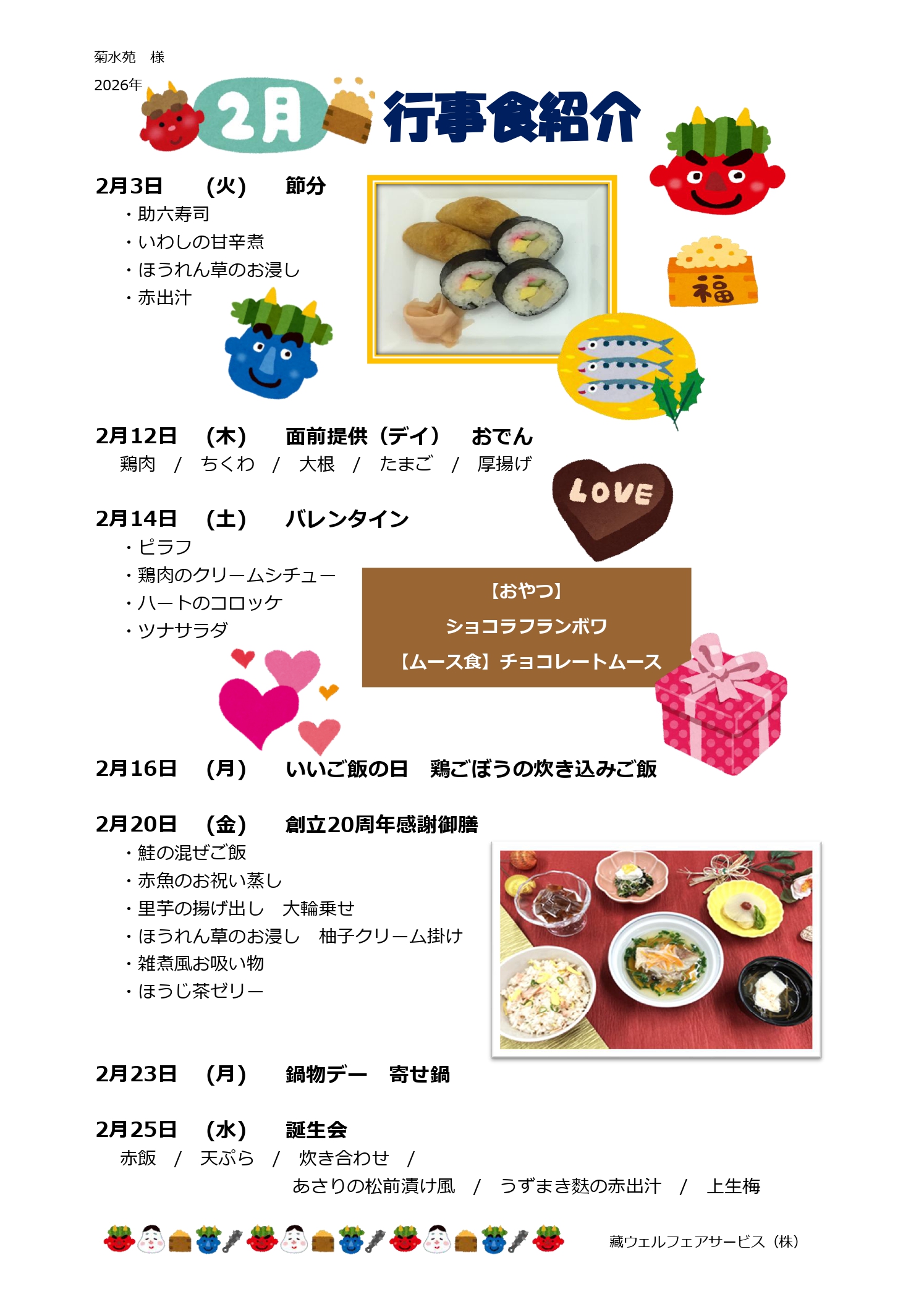 2月20日には、厨房業務を委託しております藏ウェルフェアサービス株式会社様の創立20周年記念御膳を提供いたします。社内料理コンテストの優勝メニューが提供されますので、いつもと一味違うメニューを楽しんで頂ければと思います。